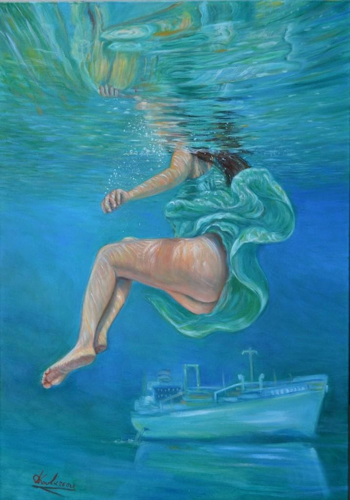 Κατεξοχήν ατμοσφαιρικά τα έργα της Δέσποινας Κουβάτσου μας ενθαρρύνουν να βιώσουμε μες από το άμεσα αναγνωρίσιμο το δυνητικά μεταφυσικό. Μαγεύει στην κυριολεξία η απόδοση του υγρού στοιχείου εδώ καθώς προικισμένο μες από τις διαθλάσεις του φωτός ενισχύει σε υποβολή, σε μηνύματα και σε αινιγματικότητα την εκάστοτε λουομένη.