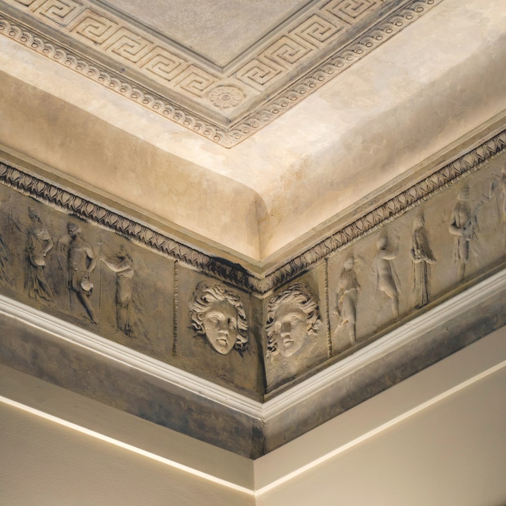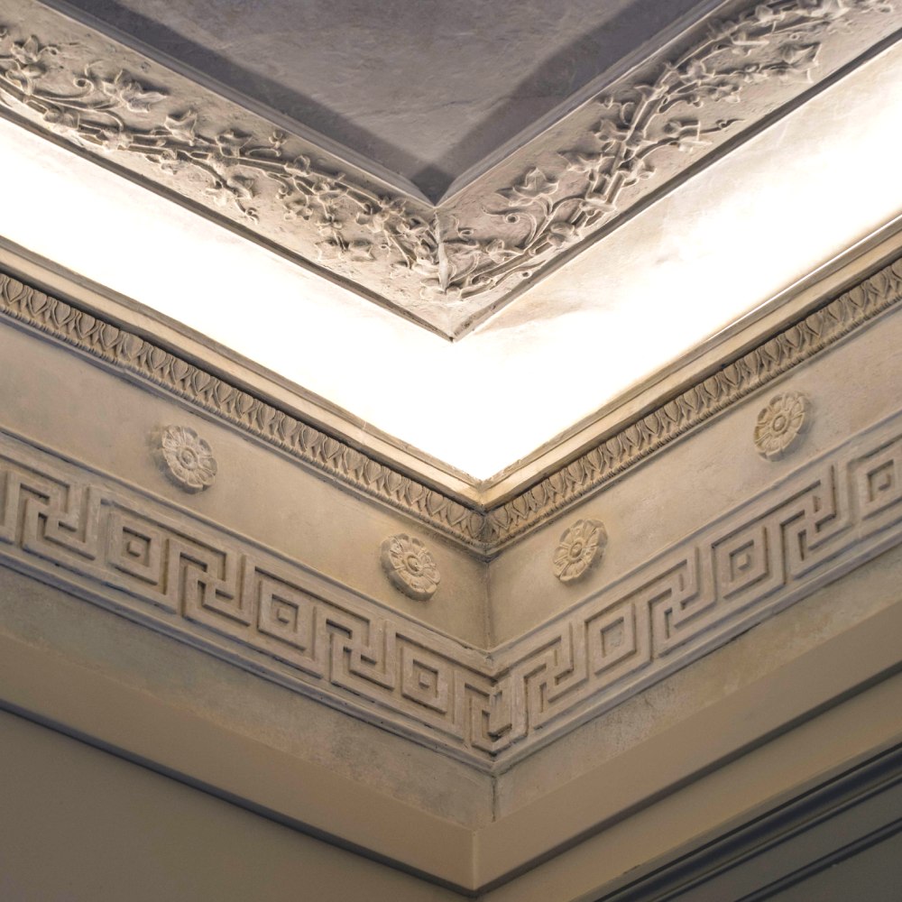 Ιδιαίτερης αισθητικής ειναι ο ζωγραφικός διάκοσμος – οροφογραφία των οροφών του ημιορόφου που αναδεικνύεται μέσω του εσωτερικού αιθρίου και απο τον ισόγειο χώρο του restaurant, και τα γύψινα διακοσμητικά μοτίβα και η ζωφόρος των οροφών του Α’ και Β΄ορόφου.