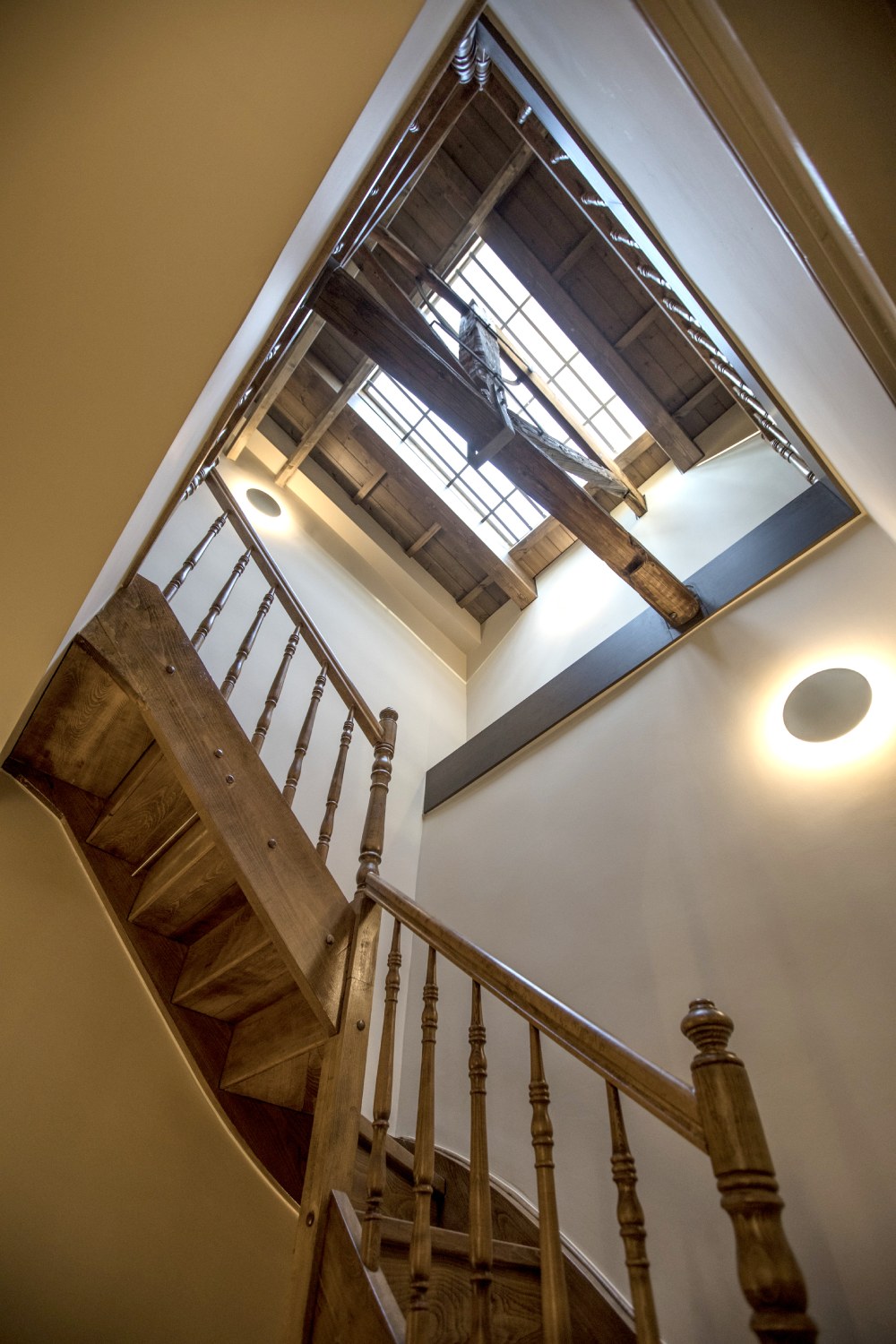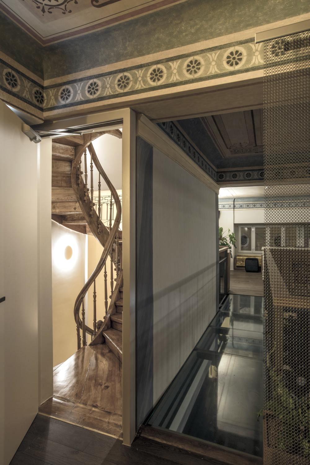 Η ξύλινη φέρουσα κατασκευή δαπέδου του ημιορόφου, διατηρήθηκε, αποκαταστάθηκε και συμπληρώθηκε με νέα στοιχεία σχεδιασμού, όπως οι κρυστάλλινες επιφάνειες των μεταλλικών γεφυρών, που διευρύνουν την οπτική του διώροφου χώρου και το δρύινο διάτρητο πέτασμα-στηθαίο, που δανείζεται στον σχεδιασμό τον ρόδακα της φρίζας του ζωγραφικού διάκοσμου της οροφής, όπως και άλλα στοιχεία και γραμμές του χώρου που μεταλλάσσονται σε νέες μορφές και χρήσεις.