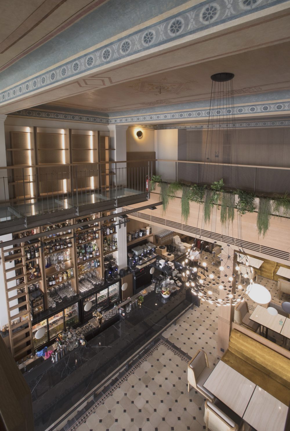 Ο πάγκος του Bar, σε minimal γραμμή εκτείνεται κατά μήκος του restaurant, ενώ το δρύϊνο έπιπλο του back bar αναπτύσσεται κατακόρυφα σε όλο το ύψος του αιθρίου και δεσπόζει στον χώρο.