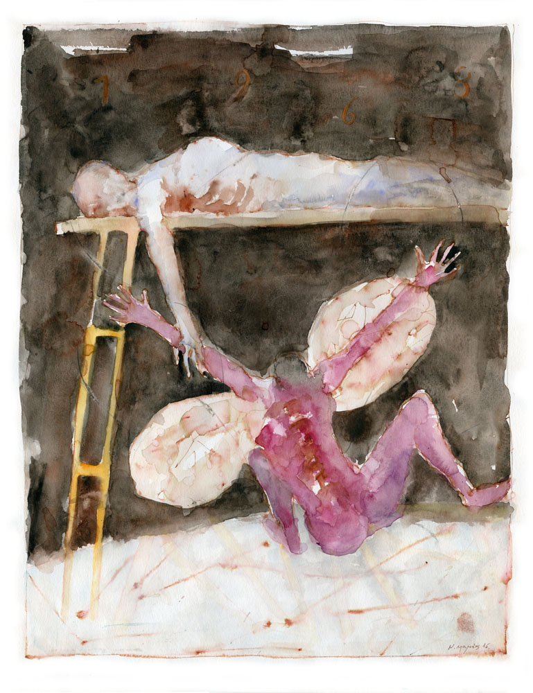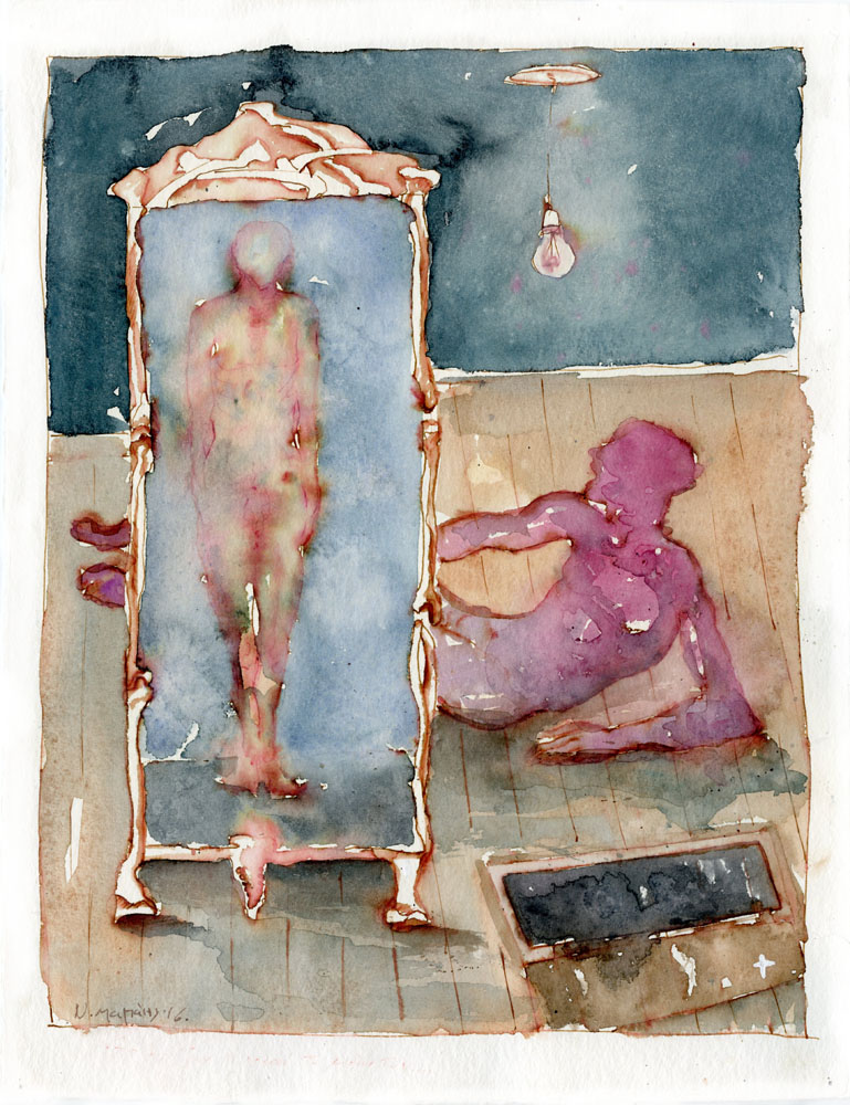 «Εξ ύδατος» μας μεταφέρει ο Μαμάης μέσα από τις ακουαρέλες του (υδρόχρωμα και πενάκι) σε έναν υδάτινο κόσμο που απλώνεται στο «Μετς» σαν απόκοσμο ενυδρείο. Το νερό «γεννά» τις αγωνιώδεις φιγούρες του που είναι σχεδόν πάντα στο κέντρο της σύνθεσης. Ο ζωγράφος ξεκινάει από μια αυτόματη γραφή κι αφήνει το ίδιο το υλικό να του χαρίσει μορφές. Κι ενώ παρασύρεται στην περιοχή της αφηρημένης τέχνης, αφήνεται ως ένα βαθμό με τρόπο οργανωμένο. Πορεύεται έτσι ζωγραφικά ανάμεσα στην παράσταση και την αφαίρεση. Στις πυκνές του ακουαρέλες ο καλλιτέχνης εκφράζεται σίγουρα, χωρίς να καταργεί τίποτε, ούτε απ’ την ρευστότητα του υλικού του, ούτε από το απρόοπτο και το ποιητικό στοιχείο που συνυπάρχουν στα έργα του. Διηγείται το σκοτεινό του παραμύθι με δυνατή ζωγραφική αίσθηση διατυπώνοντας τις μορφές του λες και θέλει να τις ξορκίσει από το δράμα τους.