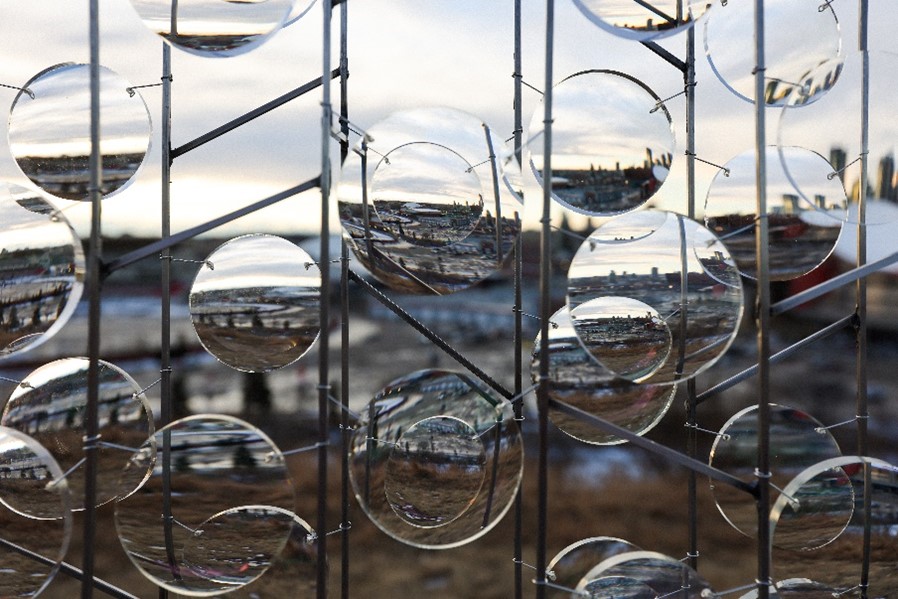 Από το εσωτερικό της εγκατάστασης, οι φακοί αποτυπώνουν και εστιάζουν μακρινές εικόνες σε θολωτούς μικρόκοσμους, που μετατοπίζονται με τον άνεμο. Έξω από την εγκατάσταση, το σώμα κάθε θεατή φαίνεται σαν ψηφιδωτό, ένα αφηρημένο φάντασμα που γίνεται μέρος ενός διαφορετικού τρόπου θέασης. Εδώ, το βλέμμα, ως φιλοσοφική πράξη αναγνώρισης, διαπλέκεται με την οπτική κουλτούρα, αποκαλύπτοντας πώς οι εικόνες και η θέαση διαμορφώνουν την εμπειρία μας και τις σχέσεις μας με τον κόσμο.
