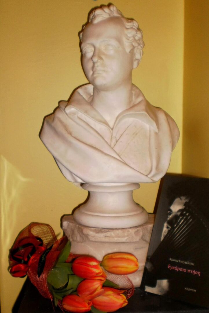 Αργότερα η απελευθερωμένη πλέον Ελλάδα τον ονόμασε τιμητικά πατέρα, ευεργέτη και ήρωα της ενώ στήθηκαν προτομές και ανδριάντες  του στα μέρη που έδρασε. Η φυσιοκρατική και ταυτόχρονα ιδεαλιστική προσωπικότητα του Λόρδου Βύρωνα εξακολουθεί να εμπνέει σχεδόν μεταφυσικά πολλούς σύγχρονους καλλιτέχνες και στοχαστές! Στην έκθεση-αφιέρωμα στα 200 Χρόνια (1821-2021) που επιμελήθηκα  στη Σύγχρονη Πινακοθήκη Villa Ροδόπη καθώς και στην επετειακή έκθεση των 200 χρόνων από τον θάνατο του το 2024 παρουσιάστηκαν εικαστικά έργα εμπνευσμένα από την ποίηση του, αντίγραφα προτομών του, γλυπτικές συνθέσεις και ζωγραφικά σχέδια με την εξιδανικευμένη εκφραστικά μορφή του, λιθογραφίες, εκδόσεις τέχνης  και φιλελληνικά αντικείμενα. Η προσωπική μου εντρύφηση στην γοητευτική προσωπικότητα και το έργο του ξεκίνησε από την παιδική μου ηλικία στην Λακήθρα της Κεφαλονιάς που επισκεπτόμουν συχνά την τοποθεσία «Ο Βράχος του Βύρωνα», σημείο όπου ο ποιητής κατά την παραμονή του στην Κεφαλονιά, κτήση με όλα τα άλλα Ιόνια νησιά της Μεγάλης Βρετανίας τότε, (Αύγουστος 1823- Ιανουάριος 1824) όταν διέμενε σε οικία των Μεταξάτων πήγαινε συχνά και στοχαζόταν. Σε μια μαρμάρινη αναμνηστική πλάκα πάνω στον υπάρχοντα βράχο έχει αναγραφεί η αποδιδόμενη ρήση του: «Αν είμαι ποιητής το οφείλω εις τον αέρα της Ελλάδος».