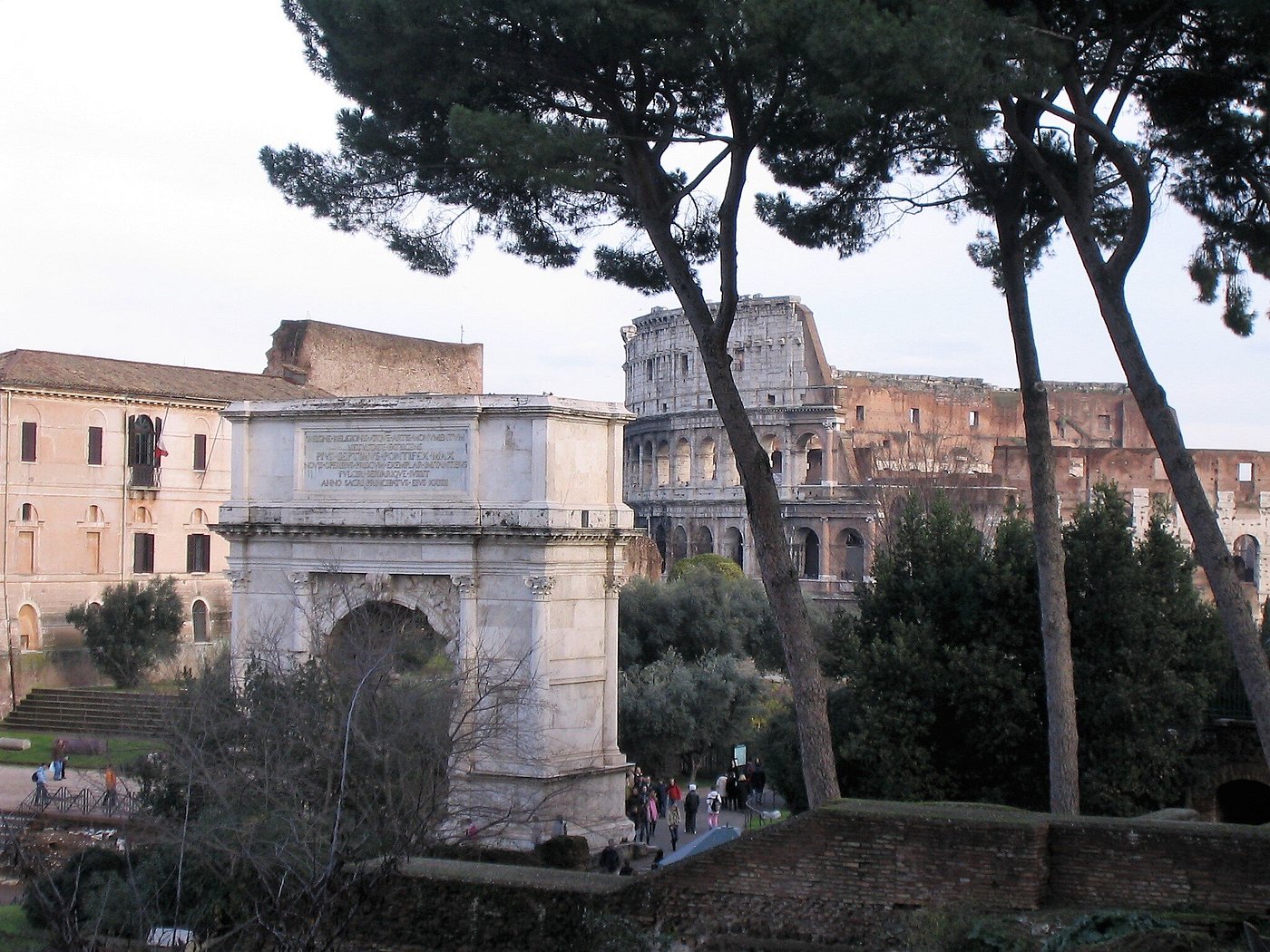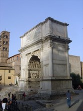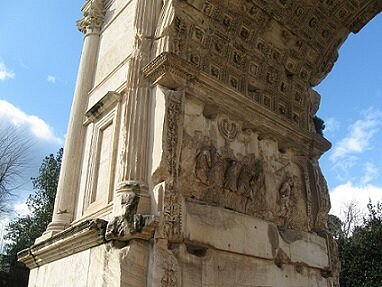 Η μονότοξη αψίδα του Τίτου ανεγέρθηκε από τον αυτοκράτορα Δομιτιανό το 81 μ. Χ., για να τιμηθούν μετά θάνατο ο μεγαλύτερος αδελφός του Τίτος και ο πατέρας του Βεσπασιανός για την κατάπνιξη της εβραϊκής εξέγερσης του 68 μ. Χ. στη ρωμαϊκή επαρχία της Ιουδαίας. Τα ανάγλυφα στις πλευρικές βάσεις του κοίλου της αποτυπώνουν τη θριαμβική πομπή στη Ρώμη το καλοκαίρι του 71 μ. Χ. μετά τη λεηλασία και την καταστροφή της Ιερουσαλήμ: Στη μια πλευρά τους  στρατιώτες με τα πολύτιμα λάφυρα και στην άλλη τον Τίτο πάνω σε τέθριππο, συνοδευόμενο από αλληγορικές μορφές και στεφόμενο από τη Δόξα.