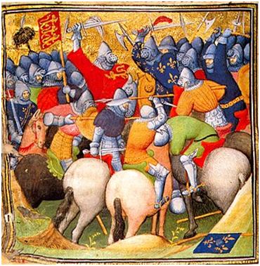 Σκηνή από τη μάχη του Κρεσύ (1346), μια από τις καθοριστικές μάχες του Εκατονταετούς Πολέμου, σε χειρόγραφο του 1415 φυλασσόμενο στη Βρετανική Βιβλιοθήκη, στο Λονδίνο.