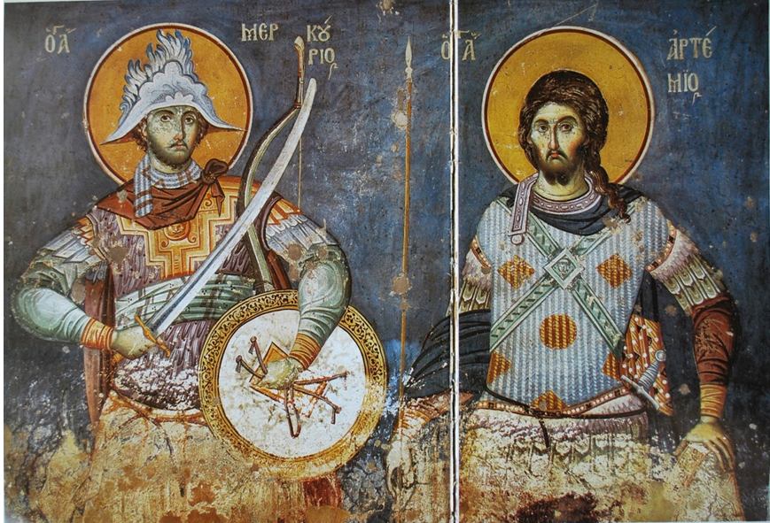 Τοιχογραφία του Μανουήλ Πανσέληνου στο Πρωτάτο του Αγίου Όρους: Οι άγιοι Μερκούριος και Αρτέμιος.