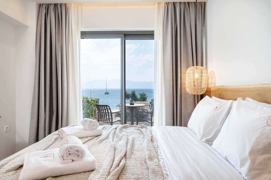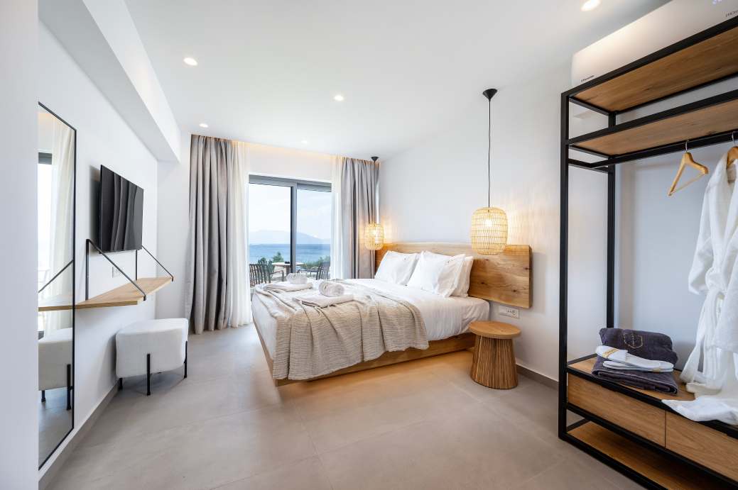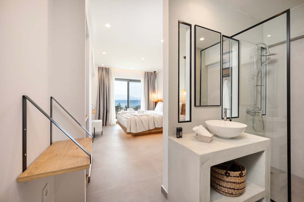 Το κτήριο είναι εναρμονισμένο απόλυτα με το περιβάλλον και όλες οι σουίτες έχουν πανοραμική θέα στη θάλασσα. Φτιαγμένες με κομψότητα και μεράκι, με γνώμονα το ξύλο, προσφέρουν ένα ακόμη θετικό χαρακτηριστικό στη συνολική εικόνα αυτού του υπέροχου boutique hotel!