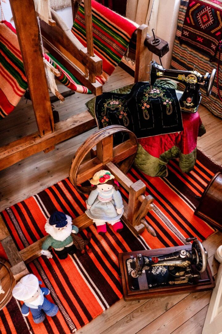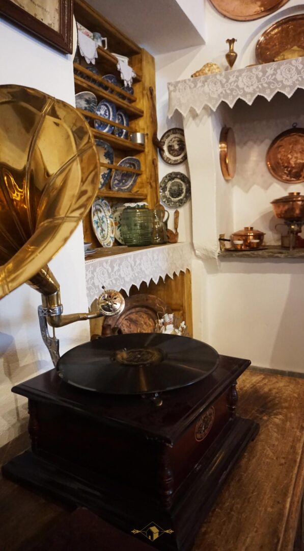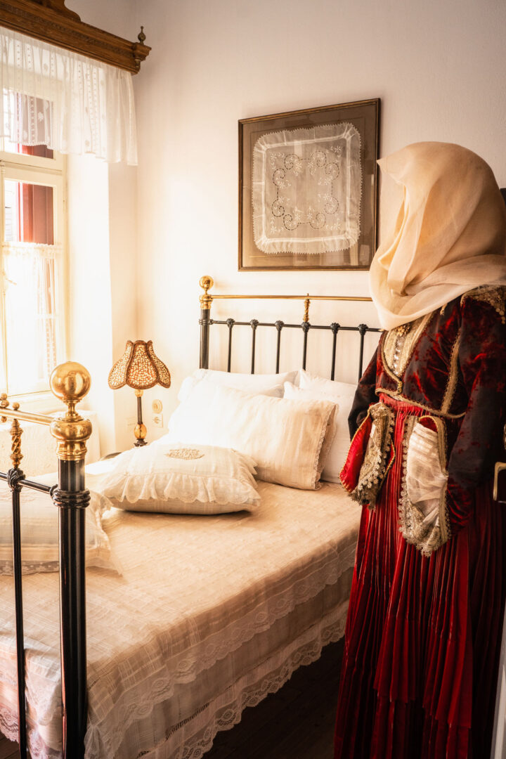 Στον όροφο θα συναντήσει κασέλες με κειμήλια, τον αργαλειό, το σιδερένιο κρεβάτι με τα αυθεντικά κεντήματα και στρωσίδια, την ξύλινη κασέλα της νύφης καθώς και σε κορνίζες οικογενειακές φωτογραφίες, με τις μορφές των παλαιότερων γενεών σε σέπια και ασπρόμαυρα πορτρέτα. Το σύνολο των εκθεμάτων σε συνδυασμό με την βιωματική ξενάγηση στο χώρο, συγκροτούν όλα μαζί μια μοναδική ατμόσφαιρα.