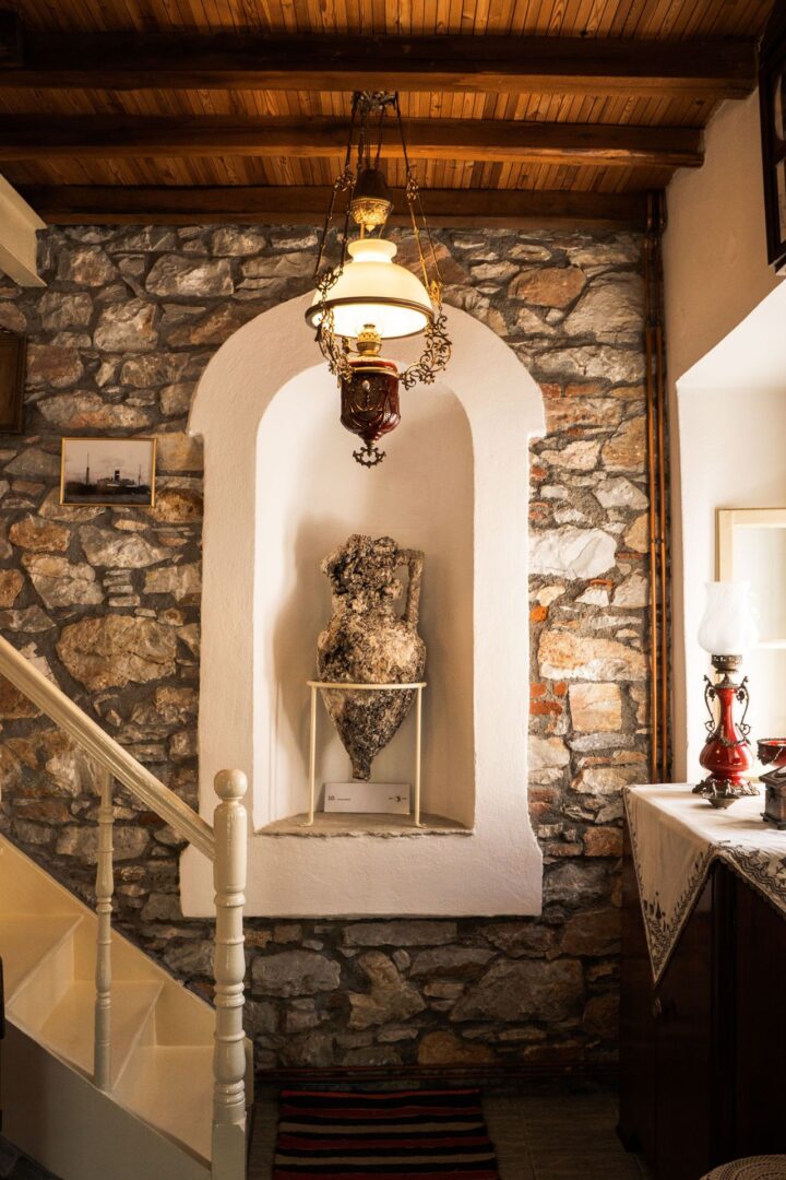 Ο επισκέπτης εισερχόμενος στο ισόγειο της οικίας θα συναντήσει αρχικά το αυθεντικό σκιαθίτικο τζάκι, τον καστρινό και τον σκιαθίτικο καναπέ, έναν πολυέλαιο του 1883, έναν αρχαίο αμφορέα του 2αι.πΧ., παραδοσιακές φορεσιές, σκιαθίτικα χαλιά, κεντήματα και κοσμήματα. Η ξύλινη σκάλα στη συνέχεια, θα τον οδηγήσει στον όροφο όπου υπάρχουν τρία δωμάτια και ένας διάδρομος, στον οποίο δεσπόζει η λιθογραφία με τον βασιλιά Γεώργιο Α΄ και την βασίλισσα Όλγα.