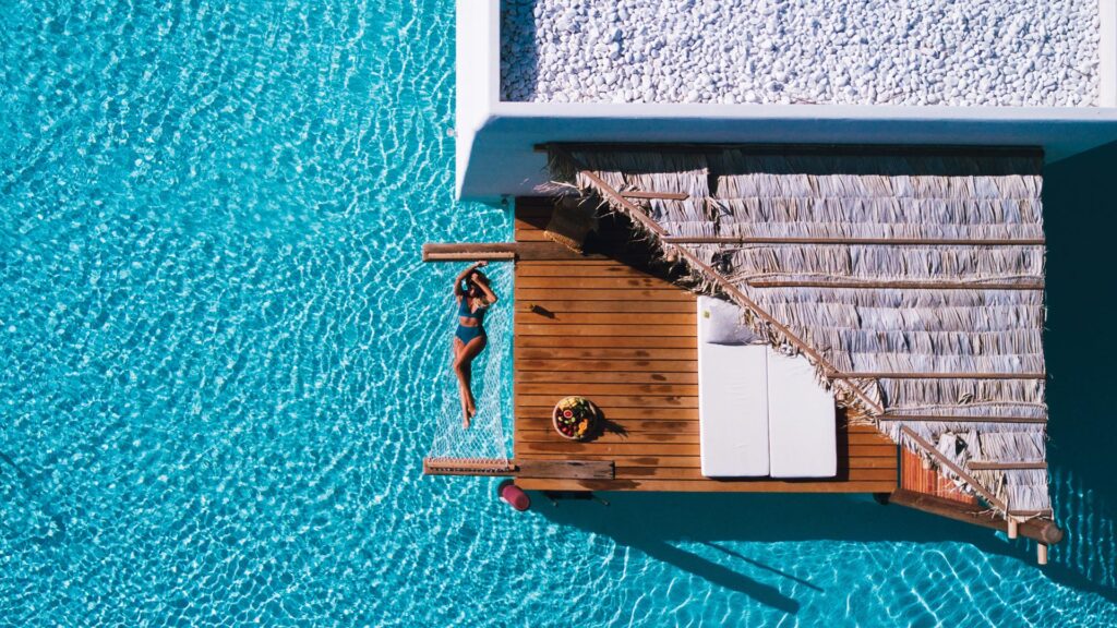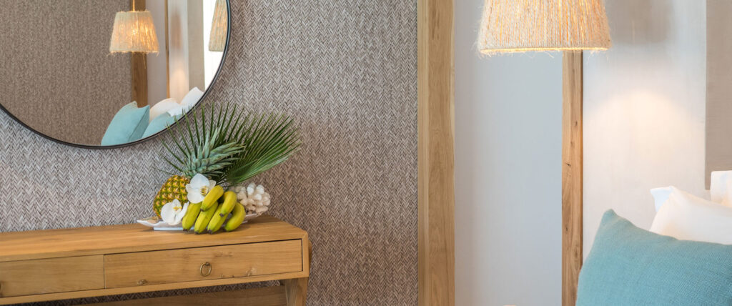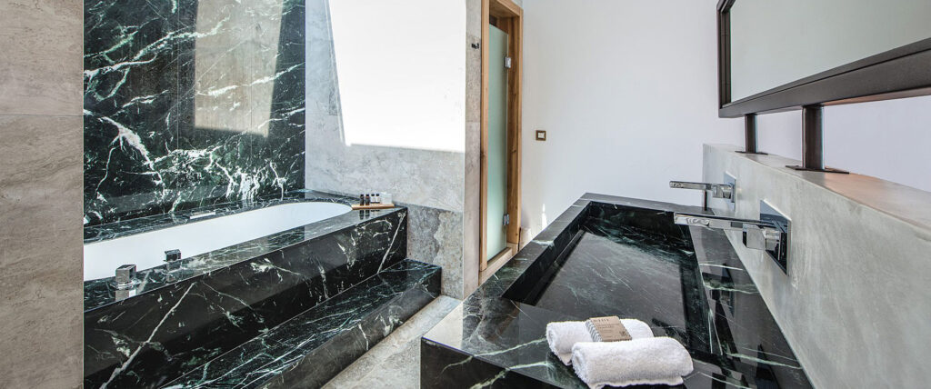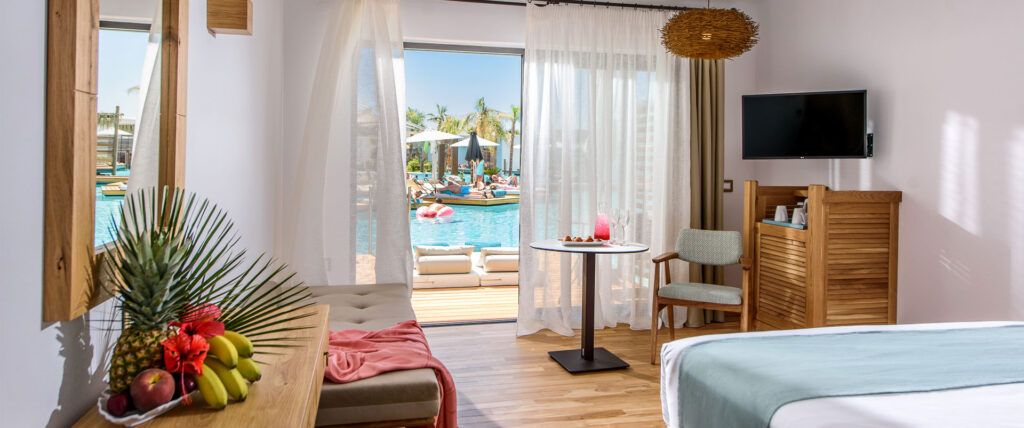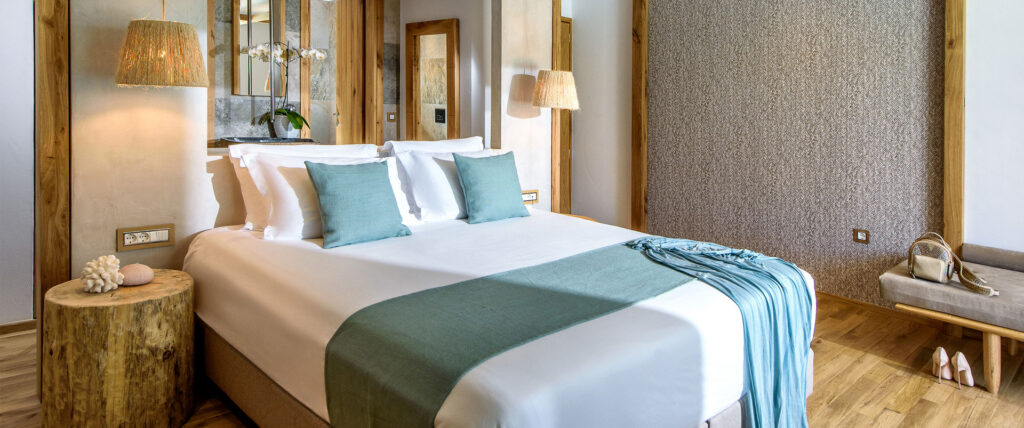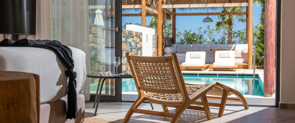 Αρχικά, αισθάνεσαι σαν να βρίσκεσαι στις Μαλδίβες. Όλες οι σουίτες και οι βίλες βλέπουν σε μια τεράστια πισίνα – με ιδιωτικό χώρο για όλους- φτιαγμένη καλλιτεχνικά με τα πιο όμορφα εξωτικά λουλούδια τριγύρω. Τα δωμάτια είναι εξοπλισμένα με επίπεδη οθόνη LCD 32 ιντσών, ελεγχόμενο κλιματισμό, ένα καταπληκτικό υπέρδιπλο κρεβάτι, ανώτερης ποιότητας ελληνικό οικολογικό εξοπλισμό μπάνιου, απολυμαντικό χεριών και πολλά άλλα. Η καμαριέρα που μας οδήγησε στη σουίτα μας δεν μπήκε μέσα στο χώρο, καθώς είχε απολυμανθεί από το Τμήμα Καθαριότητας λόγω της κατάστασης με τον covid. Ο νεροχύτης του μπάνιου ήταν φτιαγμένος από μια πολύ σπάνια μαύρη πέτρα, όπως παλιά. Το δωμάτιο μύριζε εκπληκτικά, με χαλαρωτικές νότες και μια φρεσκάδα πέρα από κάθε άλλη.
