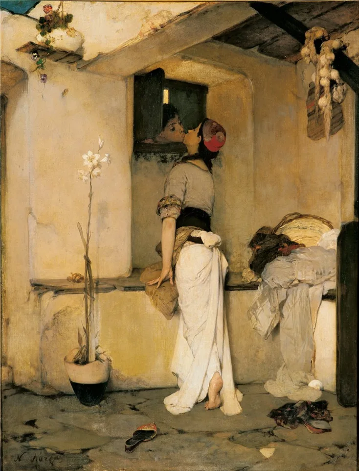 Στο έργο «Το φίλημα», ο Νικηφόρος Λύτρας αποτυπώνει μια σκηνή βαθιά ανθρώπινη και διαχρονική, όπου ο έρωτας εκφράζεται μέσα από μια απλή, αλλά φορτισμένη στιγμή. Η σύνθεση εκτυλίσσεται σε μια εσωτερική αυλή, έναν οικείο και προστατευμένο χώρο, όπου ένα λυγερόκορμο κορίτσι τεντώνεται για να φτάσει το φιλί του αγαπημένου της, που προβάλλει από ένα ψηλό παράθυρο. Η κίνηση αυτή, γεμάτη ένταση και προσμονή, καθορίζει ολόκληρη τη δομή του έργου.